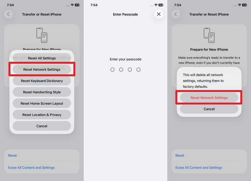 Step 2. Choose “Transfer or Reset iPhone > Add Passcode > Pick Reset Network Settings” option to confirm.