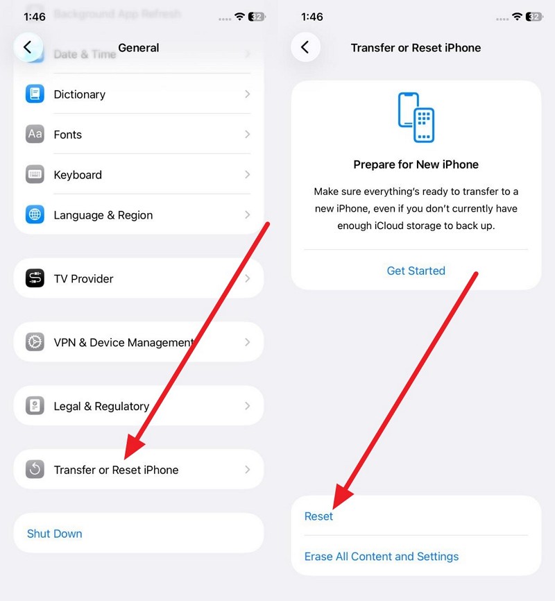 Step 1. Pick “Transfer or Reset iPhone” in General settings and press “Reset.”